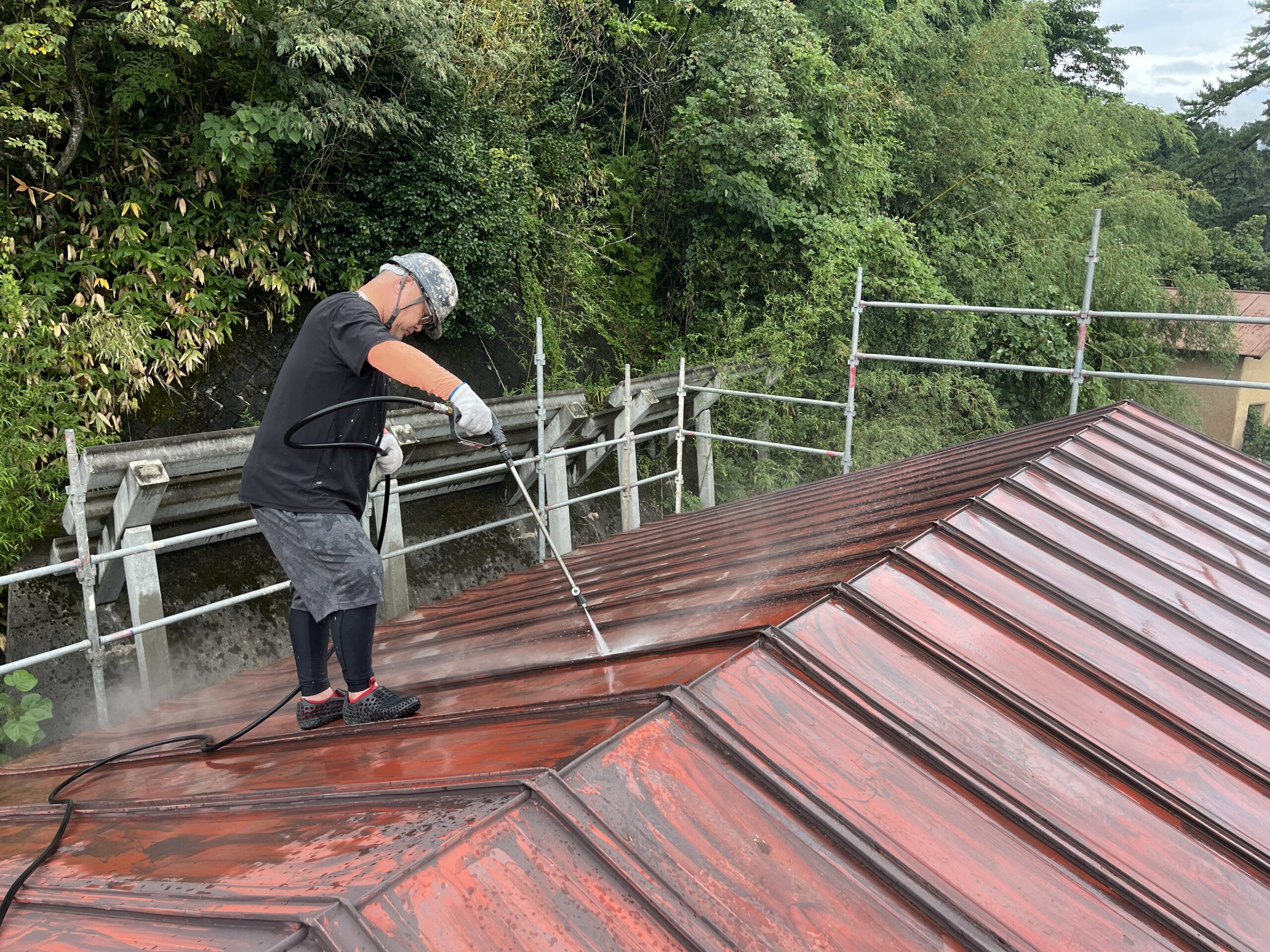 水洗いをしている直樹君。本当は私だけで作業を行う予定でしたが、午前中のリペア工事の作業が押してしまい、急遽駆けつけてくれました。