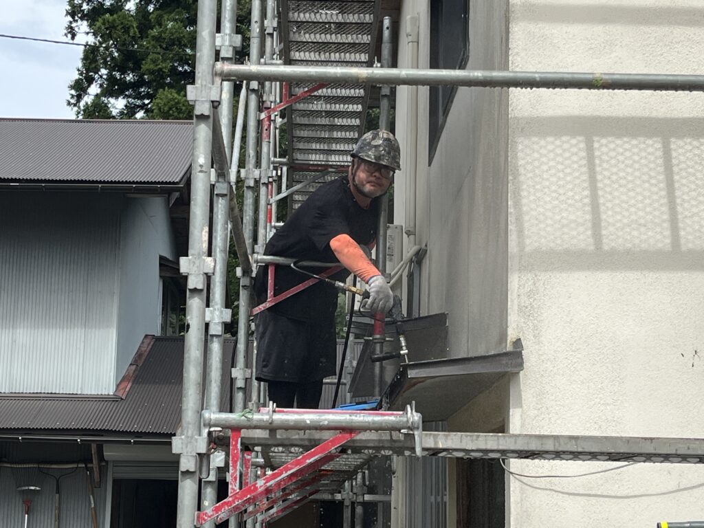 積雪時は凍害により塗膜がはぐれる事もあるので、脆弱な塗膜は水洗いと研磨で除去。この工程が非常に大事になります。皆様の大切なお家も、地元で創業40年の吉田塗装に、一声お掛け頂けましたら、と、思います。