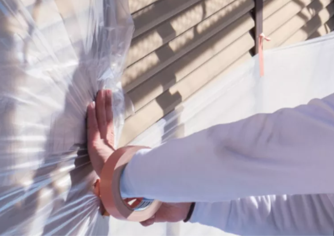 養生(ようじょう)とは、サッシや窓、エアコンのパイプ、ガスメーターや水道管など、塗る必要が無い部分をビニールで覆う作業のことを言います。