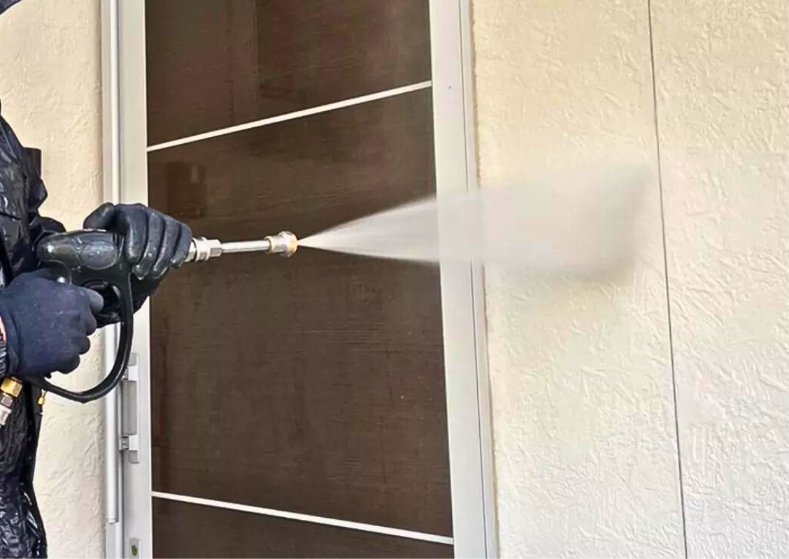 足場架設の次には、高圧洗浄を行います。高圧洗浄では、塗装をする前に、外壁についている汚れや不純物、特にコケやカビ、チョーキング現象によって浮き出た粉などをしっかり取り除き、塗装に適する塗布面に仕上げることが目的です。